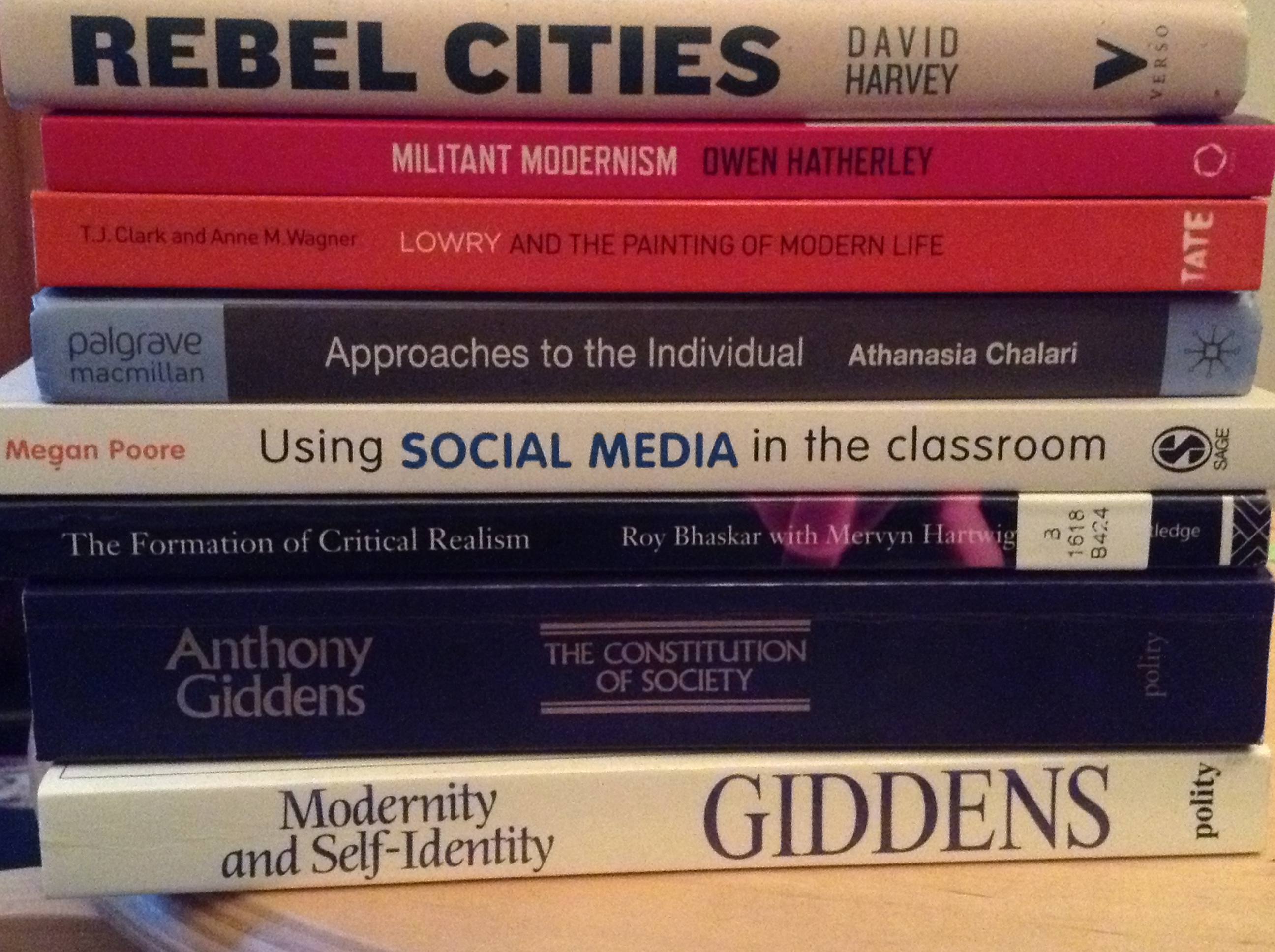 I’ve been ‘currently reading’ The Constitution of Society and Modernity and Self-Identity for a couple of months now. The first chapter of my PhD thesis is an extended critique of Giddens and the latent structurationism which lurk beneath the surface of his late modernity books. In essence I argue that he ties himself in knots partly because the deficiencies of structurationist theory become much more pronounced when an attempt is made to conceptualise reflexive responses to social change – too much of agency is incorporated into structure and it leaves Giddens vacillating wildly between depth psychology and a view of subjectivity (at ‘fateful moments’) which comes weirdly close to rational choice theory in its view of risk calculation and life-planning. I’ve read Modernity and Self-Identity twice before and I’ve engaged quite a lot with the Constitution of Society but had never read it cover to cover. Having become rather infuriated with Will Atkinson’s facile and lazy reading of Margaret Archer in his last book I suddenly found myself wondering if I might have inadvertently done the same thing with Giddens. I’m fairly confident I haven’t but still feel I must finish the two books before I submit my thesis. Plus perhaps finish off Central Problems in Social Theory which I was actually quite enjoying but keep giving up on simply because it’s simultaneously much less relevant and much more difficult a read.