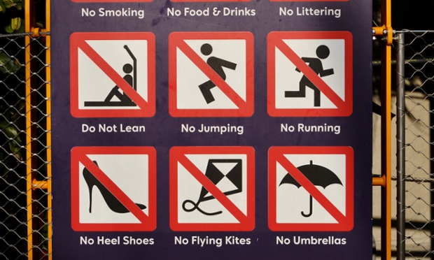 Crouch is far from the only theorist to have made such a claim. But I think there’s a precision to his argument which distinguishes it from the manner in which someone like, say, Bauman talks about depoliticisation. My current, slightly morbid, interest in representations of civilisational collapse has left me wondering what entrenched post-democracy would look like. Asking this question does not refer to an absence of democracy, for which endless examples are possible, but rather for a more detailed sketch of what a social order which was once democratic but is now post-democratic would look like. While everyday life might look something like that which can be seen in Singapore, ‘the city of rules’ as this Guardian article (from which the picture is taken) puts it, I think there’s more to be said than this. However we can see in Singapore a vivid account of how micro-regulation can be deployed to facilitate a city in which ‘nothing goes wrong, but nothing really happens’ as one ex-pat memorably phrases it in that article. Is it so hard to imagine efficiency and orderliness being used to secure consent, at least amongst some, for a similar level of social control in western Europe or America?