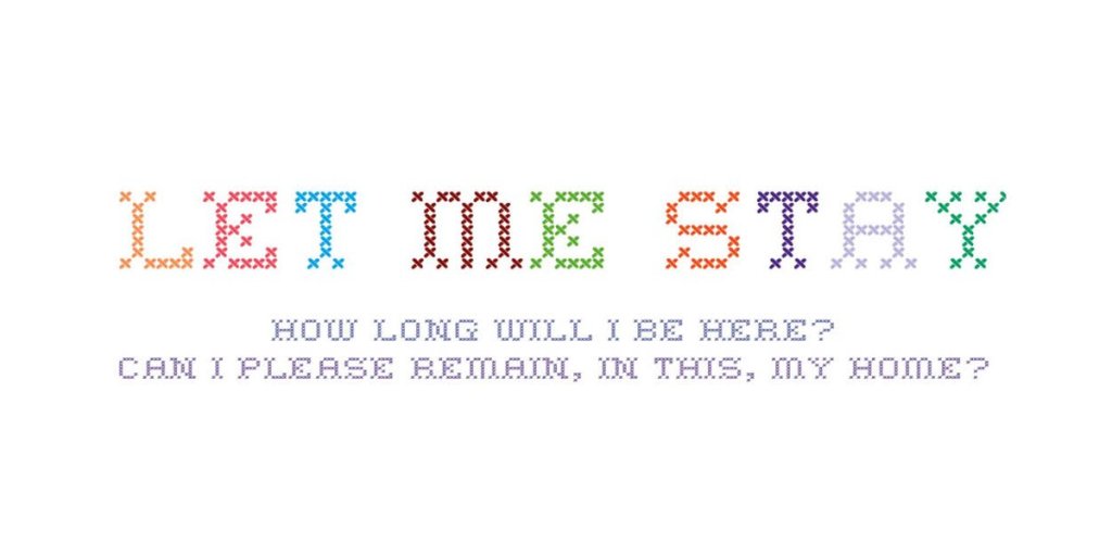 ‘Let Me Stay’ uses the traditional craft of embroidered labels attached to read-mades such as doll’s furniture and crockery, samplers which are all placed within this installation to explore precarity and insecurity – to contribute to a much needed debate on the condition of houses not being homes for many people in society.