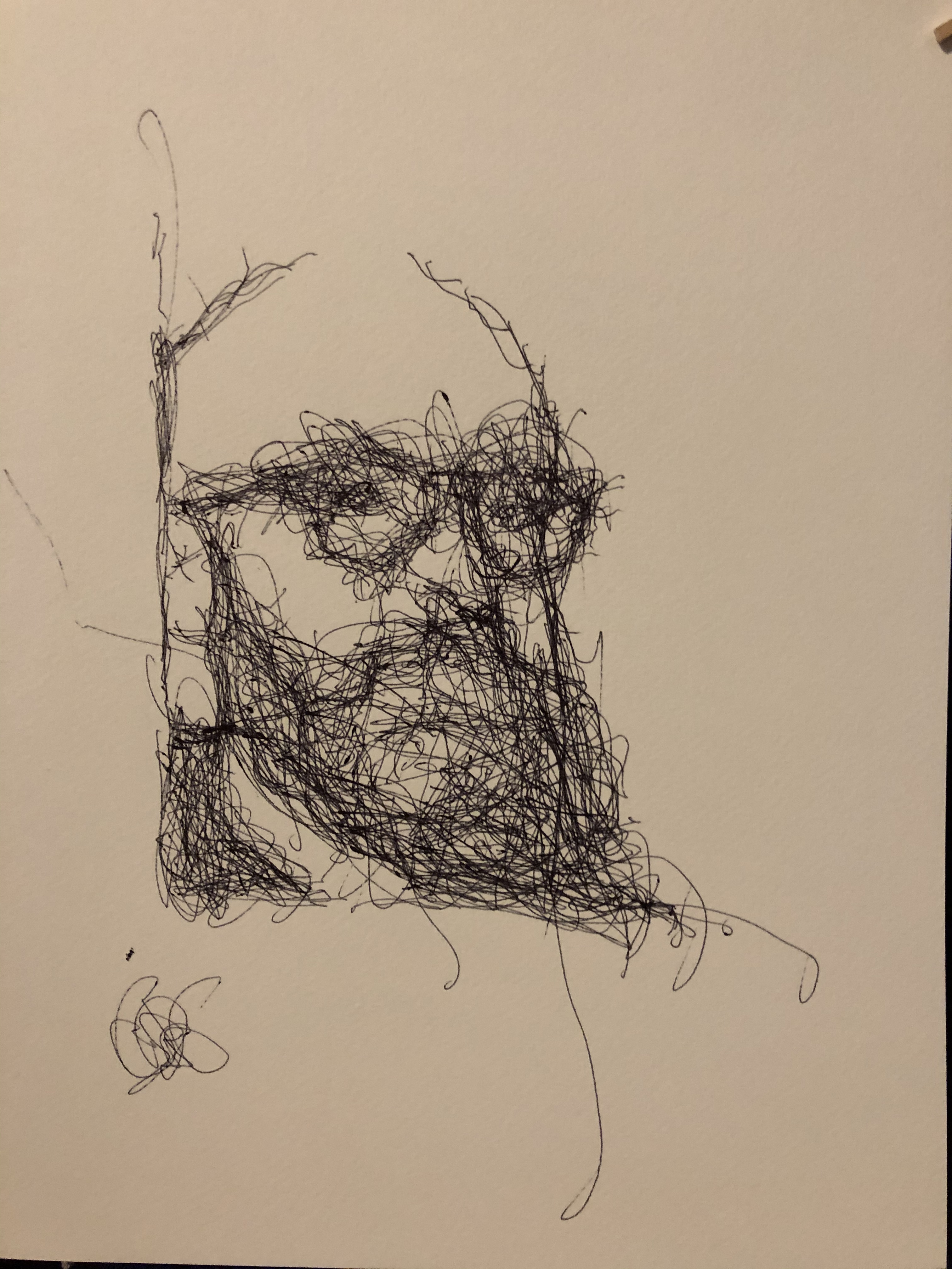 This was drawn by Patrick Tresset’s robot It was a strange and engaging experience to see the machine compose this through an iterative sequence of seemingly random lines. It was also striking how many people approached me in the exhibition when I was standing next to it drawing me, as everyone immediately began treating me as part of the exhibition.