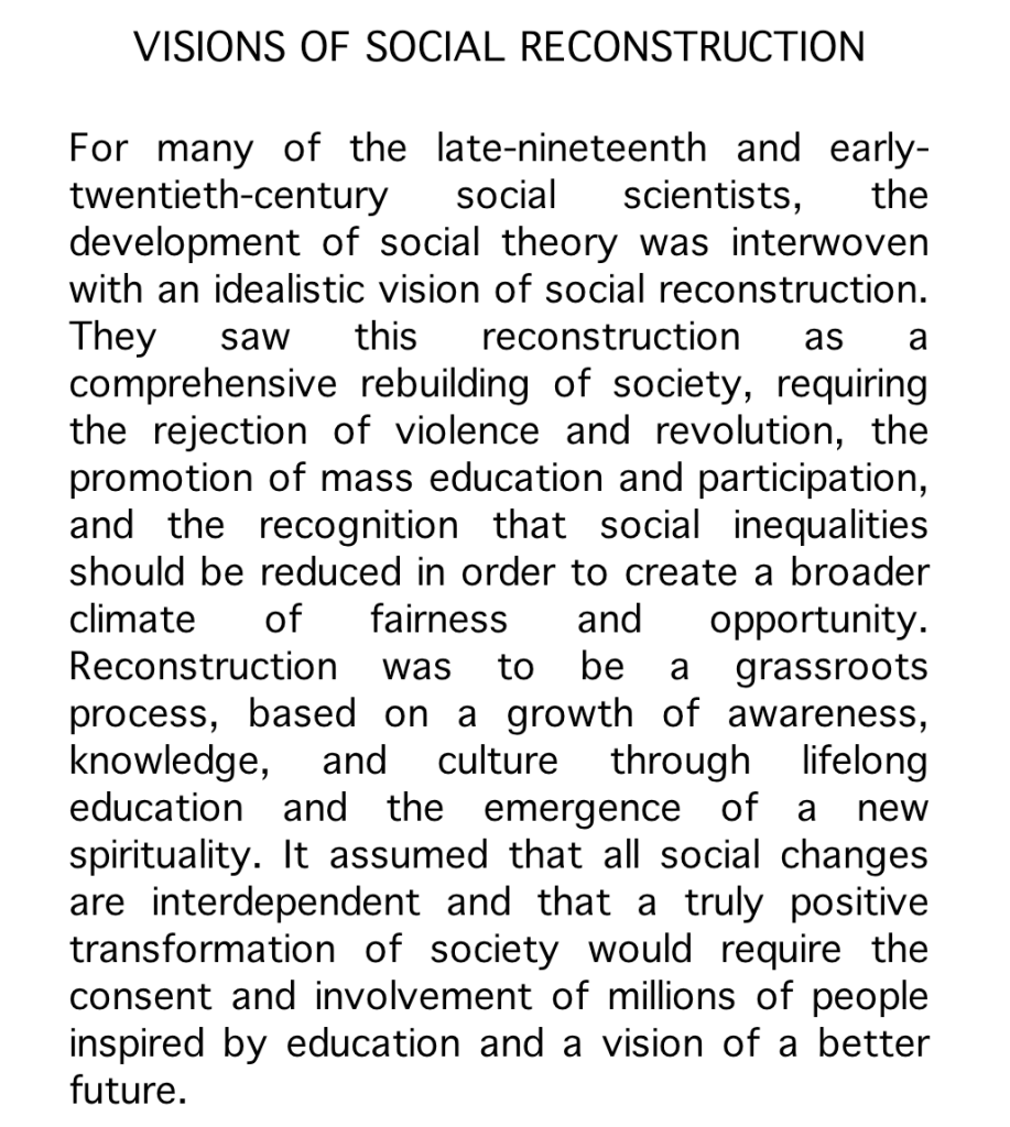 Early 20th century social science was driven by a vision of social reconstruction, described here by John Scott and Ray Bromley in their Envisioning Sociology, loc 323: