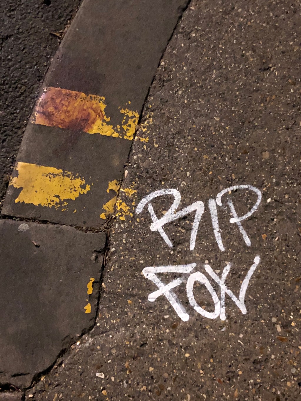 A fox who had been visiting houses on our street was hit by a car early this morning, presumably by someone speeding over a bridge that had only recently been reopened to traffic. I was walking past this evening and found the fox’s death had been commemorated in a way I found really touching: