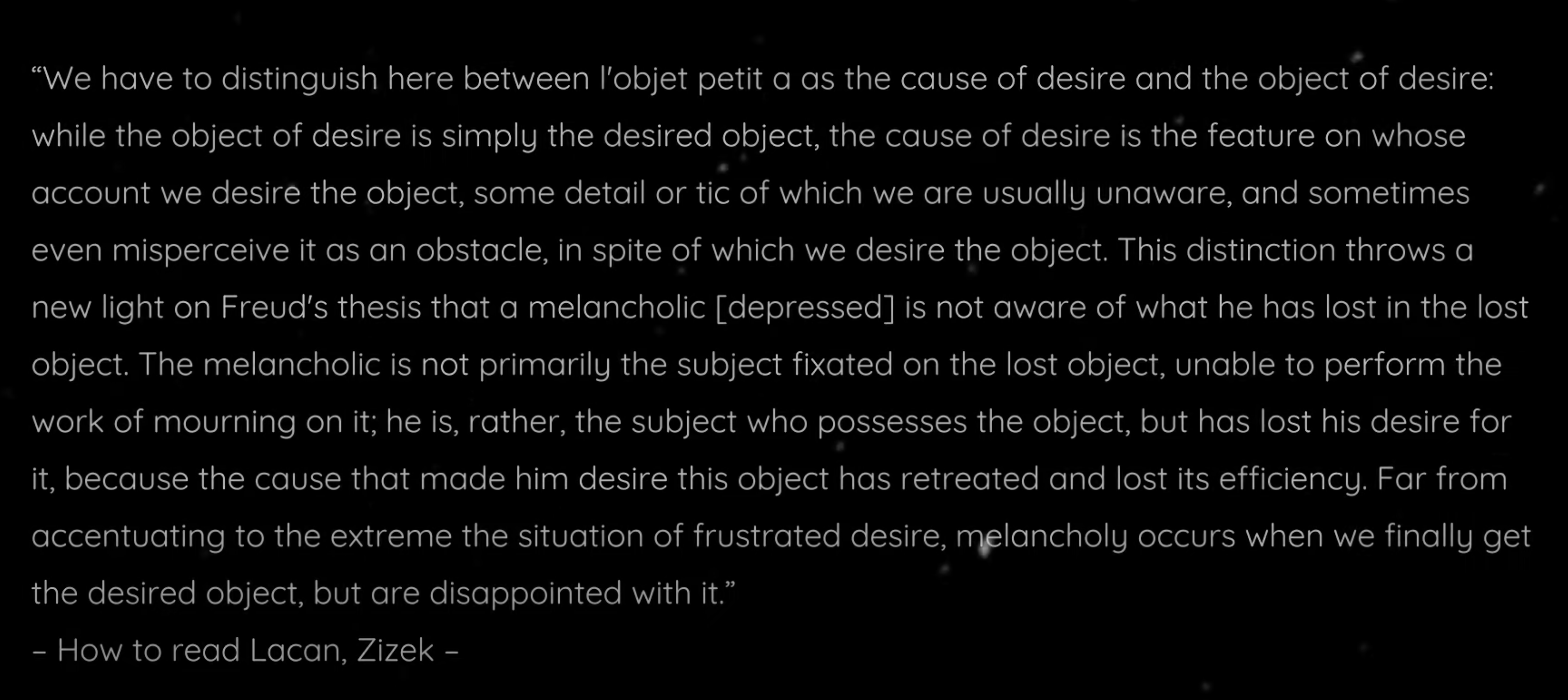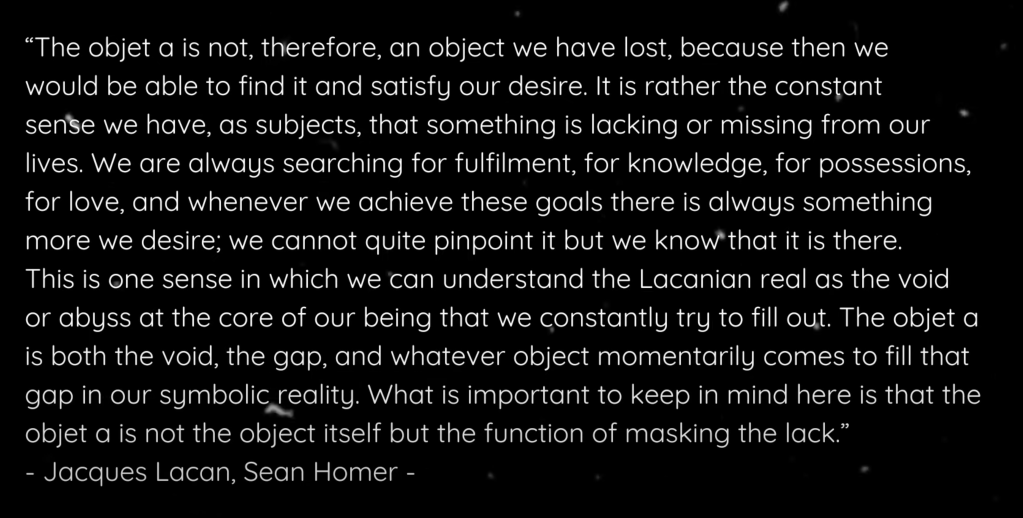 Here are the remaining six parts of the lecture. There were a couple of other videos I enjoyed while going down this psychoanalytical rabbit hole today. I’ve been thinking a lot about Objet petit a recently, explained by Hook as the positivisation in the Other of the lack within myself.