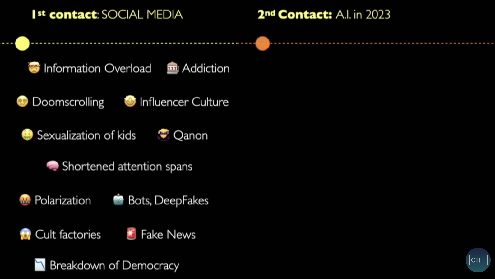 Harris describes social media as the ‘first contact with AI’ with huge unintended consequences following from the seemingly innocuous aspiration to maximise engagement. We’re now seeing a ‘second contact’ in which we move from machine curation to machine creation: