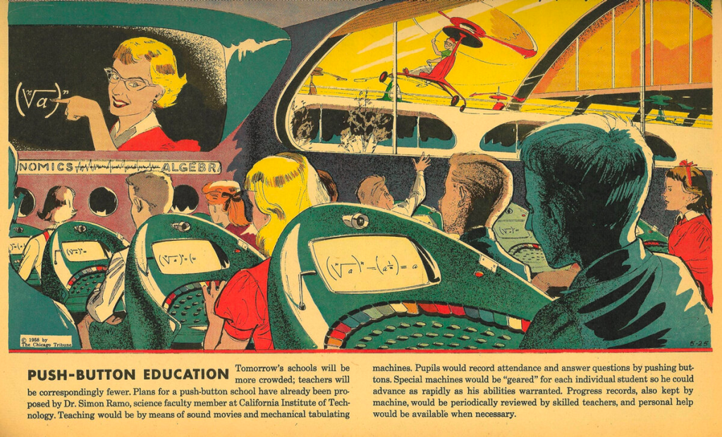 The image showcases a mid-century, retro-futuristic art style. Key characteristics include: