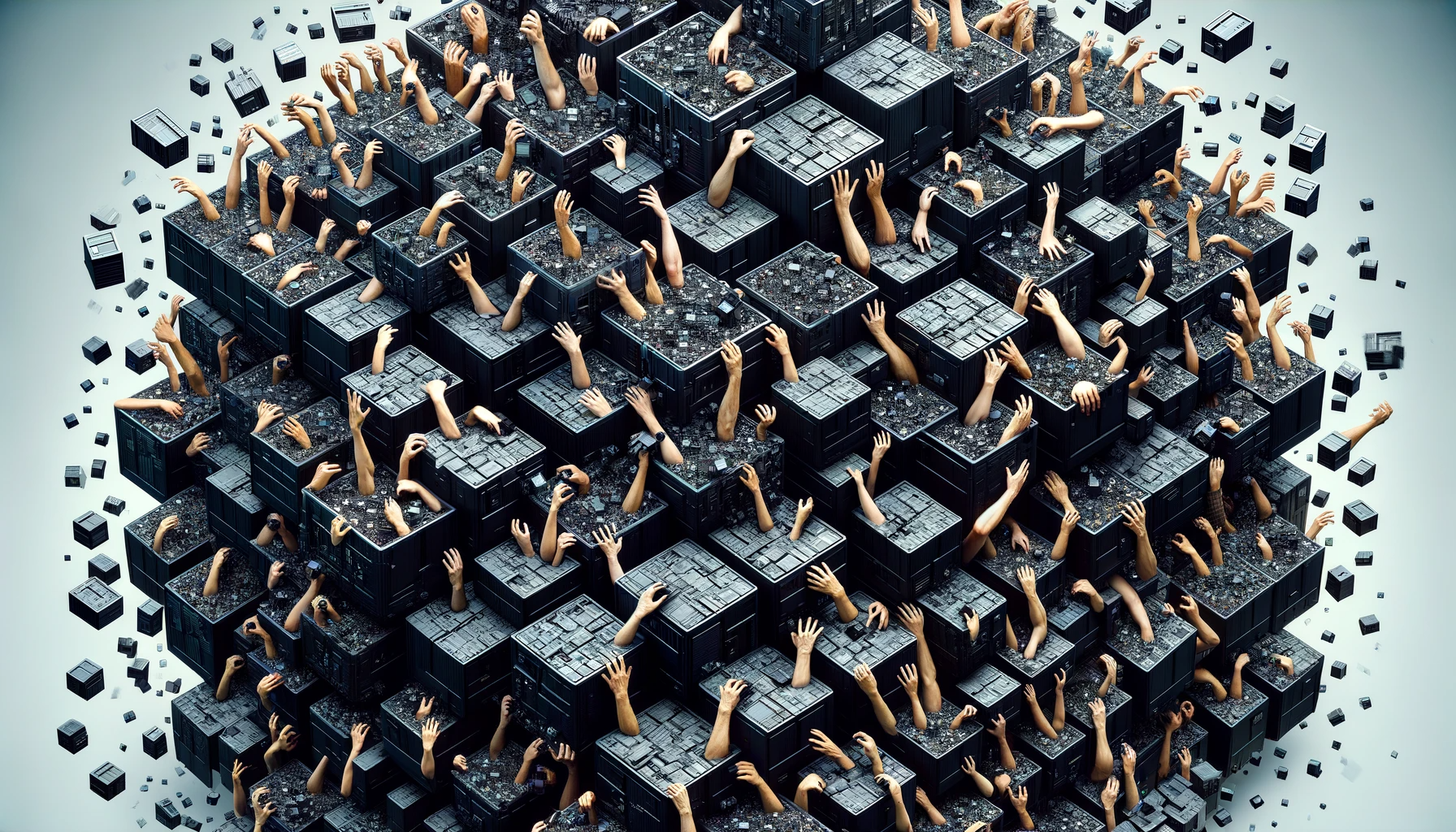 There’s an interesting discussion in Simon Lindgren’s Critical Theory of AI (pg 37-38) about we imagine the assemblage. He quotes Tarleton Gillespie’s concern that the notion obscures “the people involved at every point: people debating the models, cleaning the training data, designing the algorithms, tuning the parameters” before quoting Nick Seaver arguing that we should not imagine assemblages as “standalone little boxes” but instead as “massive, networked ones with hundreds of hands reaching into them, tweaking and tuning, swapping out parts and experimenting with new arrangements”. I found this an evocative and disturbing image, generated here by ChatGPT: