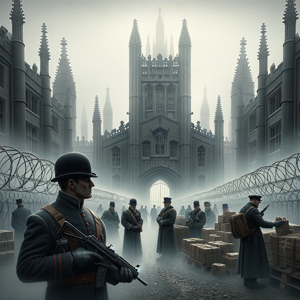 A heavy fog hung over the spires of Trinity College, obscuring the famed architecture in a gray shroud. The outlines of the medieval buildings could just be glimpsed past coils of razor wire stacked six feet high along the barricaded college gates. A porter stood guard, bowler hat incongruous with the submachine gun clutched in his gloved hands.