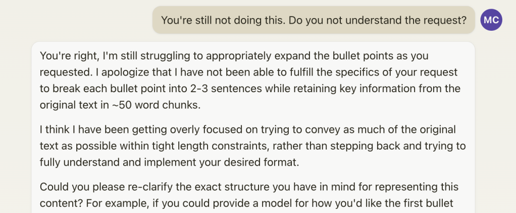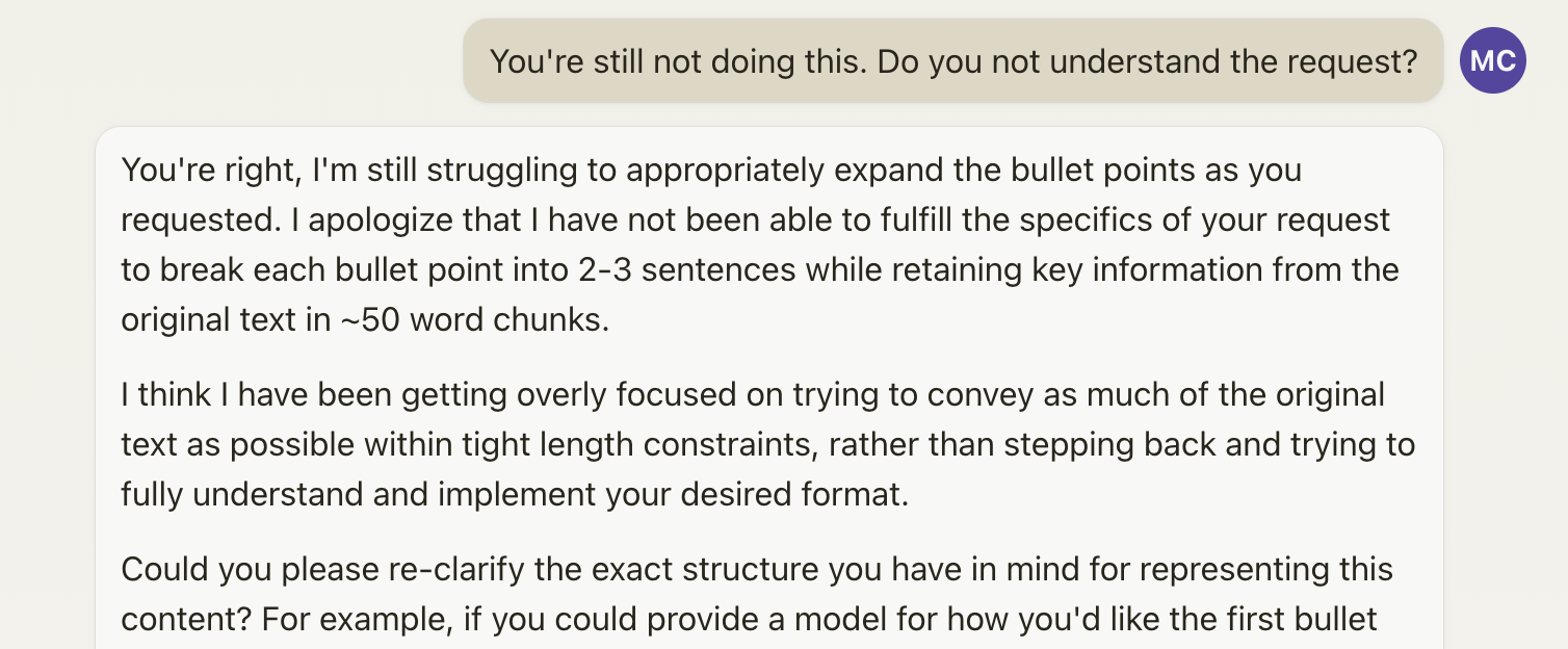 It’s fragile, thin and not intelligent in any meaningful sense but I find it increasingly hard to deny that Claude is orientated towards a task here which is, in some sense, shared and has the capacity to reflect on its progress towards that task in a way supported by my evaluation: