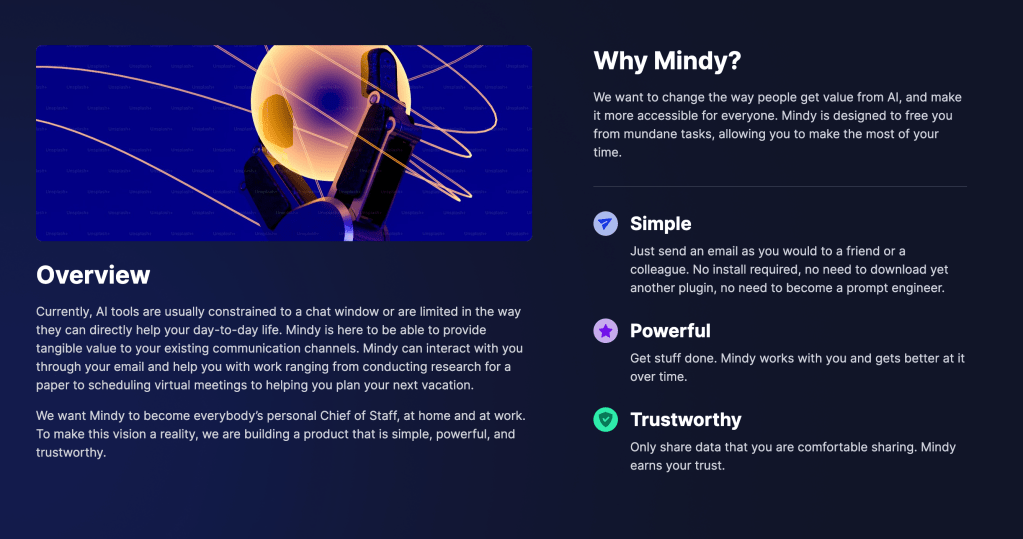 If you set aside the gendering of the name, as well as the obvious ambitions to eliminate remote assistants (whose salary and conditions have already been crushed by freelancing platforms) there’s a narrow sense in which this could be an effective proposition taken up by a lot of people. But at present Mindy is producing GPT 3.5 levels of response which are pretty useless for the real world tasks I tried with the service. Watch this space though, if they get this working it could be commercially successful.