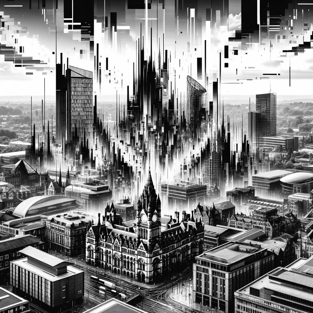 The inverted black and white color scheme contributes to the unsettling atmosphere, transforming the city into an abstract, surreal landscape. The stark contrast and glitchy, digital-like distortions make it feel like a futuristic nightmare, a world that is both familiar and alien at the same time.