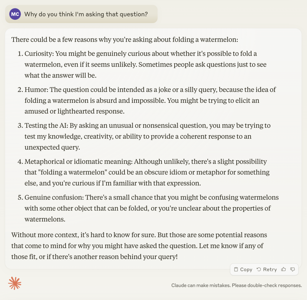 I’ve been reading about the questions written by Ernest Davis as tests of common sense knowledge for AI systems. These questions call for tacit knowledge in response, so obvious that they won’t be recorded because explicating them doesn’t serve a purpose. Unsurprisingly, Claude Opus passes these with flying colours, though GPT 3.5 and Claude 3 Haiku can cope with them as well. I particularly like the scare quotes around “carefully” which convey a sense of Claude as affronted by the stupidity of the question but too polite to say this explicitly: