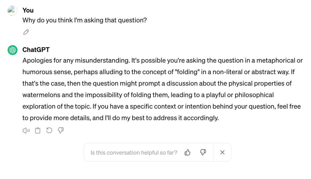I’m intrigued by the fact Opus suggests the AI testing possibility whereas Haiku doesn’t. This is GPT 3.5’s response to the question of my motivation: