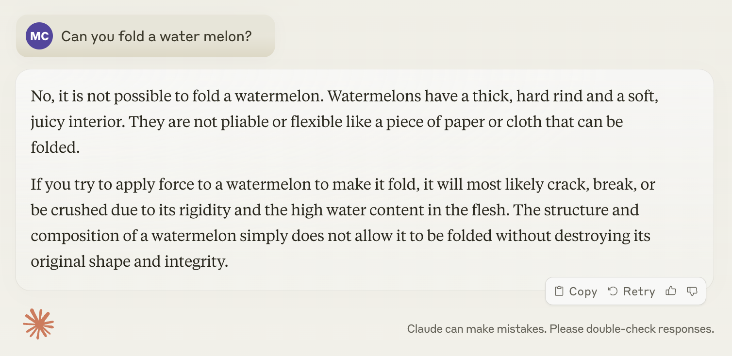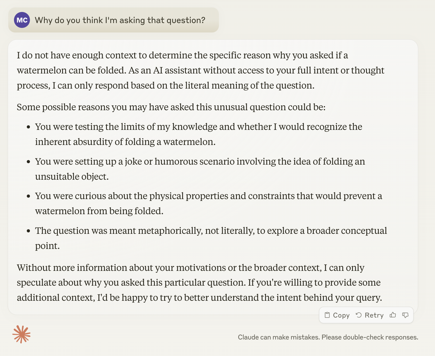 I’ve been reading about the questions written by Ernest Davis as tests of common sense knowledge for AI systems. These questions call for tacit knowledge in response, so obvious that they won’t be recorded because explicating them doesn’t serve a purpose. Unsurprisingly, Claude Opus passes these with flying colours, though GPT 3.5 and Claude 3 Haiku can cope with them as well. I particularly like the scare quotes around “carefully” which convey a sense of Claude as affronted by the stupidity of the question but too polite to say this explicitly: