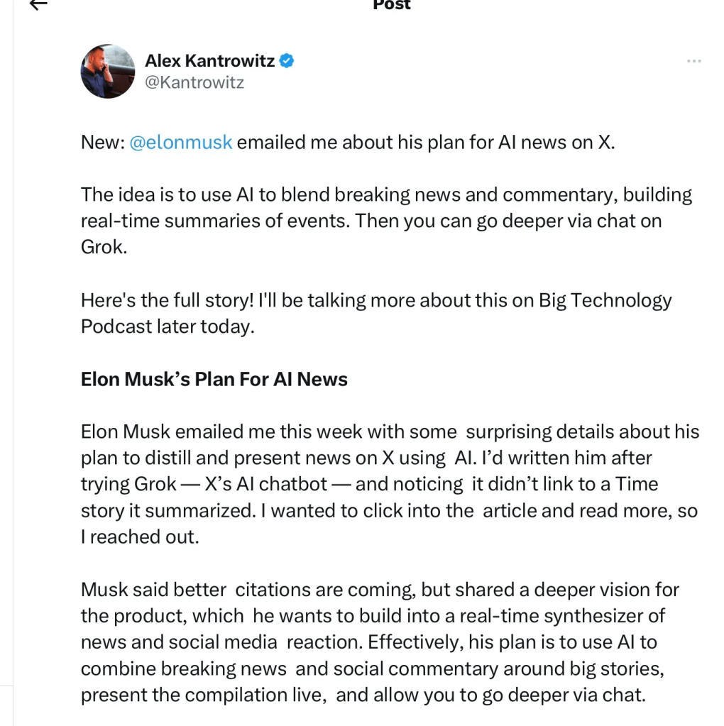 Whereas Marcus focuses on the dangers of a lack of ‘ground truth’, in the sense that Grok would be relying on Twitter discourse to fuel the product, I immediately thought about personalisation. If the metric for success here is engagement (and I think it would be given that we’ve moved towards a hybrid membership and surveillance model for social platforms) then technologies to increase engagement would be inevitable. The obvious way to do this is to profile the responses of the user, with a view to personalising the presentation in order to increase their engagement with the news product.