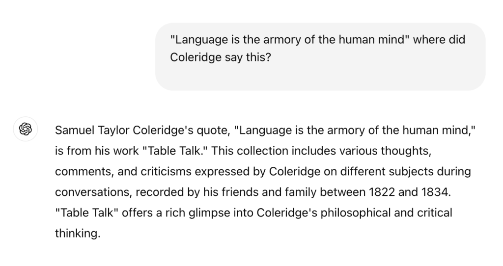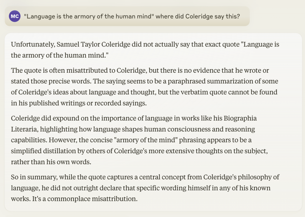 But upon closer inspection this quote seemingly isn’t in Table Talk after all, suggesting that Claude’s initial response was right. However what’s interesting is how they both immediately backed down when challenged. They also made claims about their searching (as if they were consulting a database) which simply aren’t true: