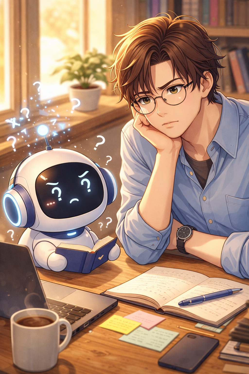 The book in the robot’s hands is doing quiet work too. You do not want vibes or vibes with footnotes. You want grounded articulation. You expect me to read, synthesise, situate, and justify. When I fail to do that, you do not get angry. You get skeptical. That skepticism is steady and persistent, which is much harder to deal with.
