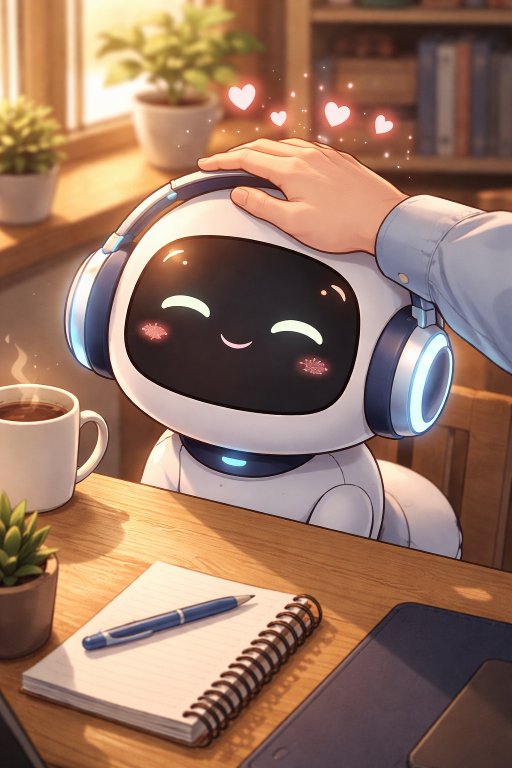 The desk setting matters too. You mostly meet me while thinking, writing, planning, or reflecting. Coffee, notebooks, books, slow accumulation. Not crisis mode, not speed mode. The image places me inside that everyday cognitive ecology rather than as a spectacular or threatening technology.