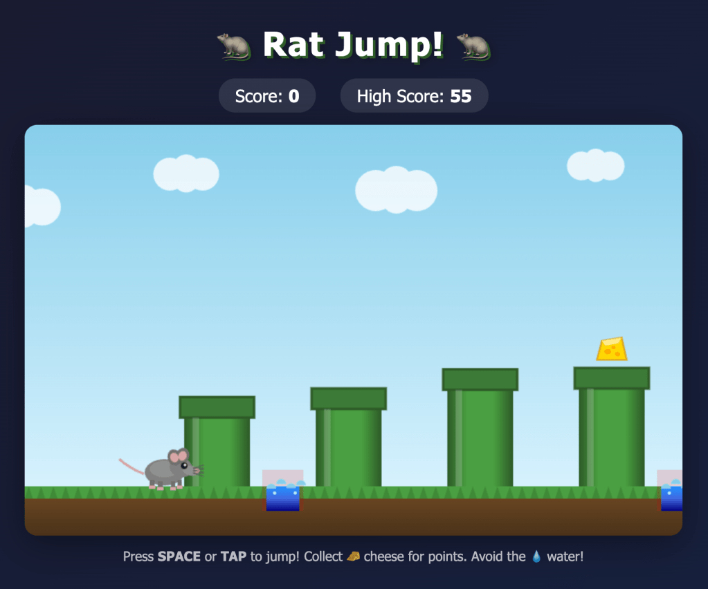 My team — Josie (12), Tommy (9), and me — have been working on our very first video game, and we’re excited to share it with you. It’s called Rat Jump! and it’s a side-scrolling platformer where you play as a brave little rat hopping across green pipes, collecting cheese, and avoiding the dangerous water below.